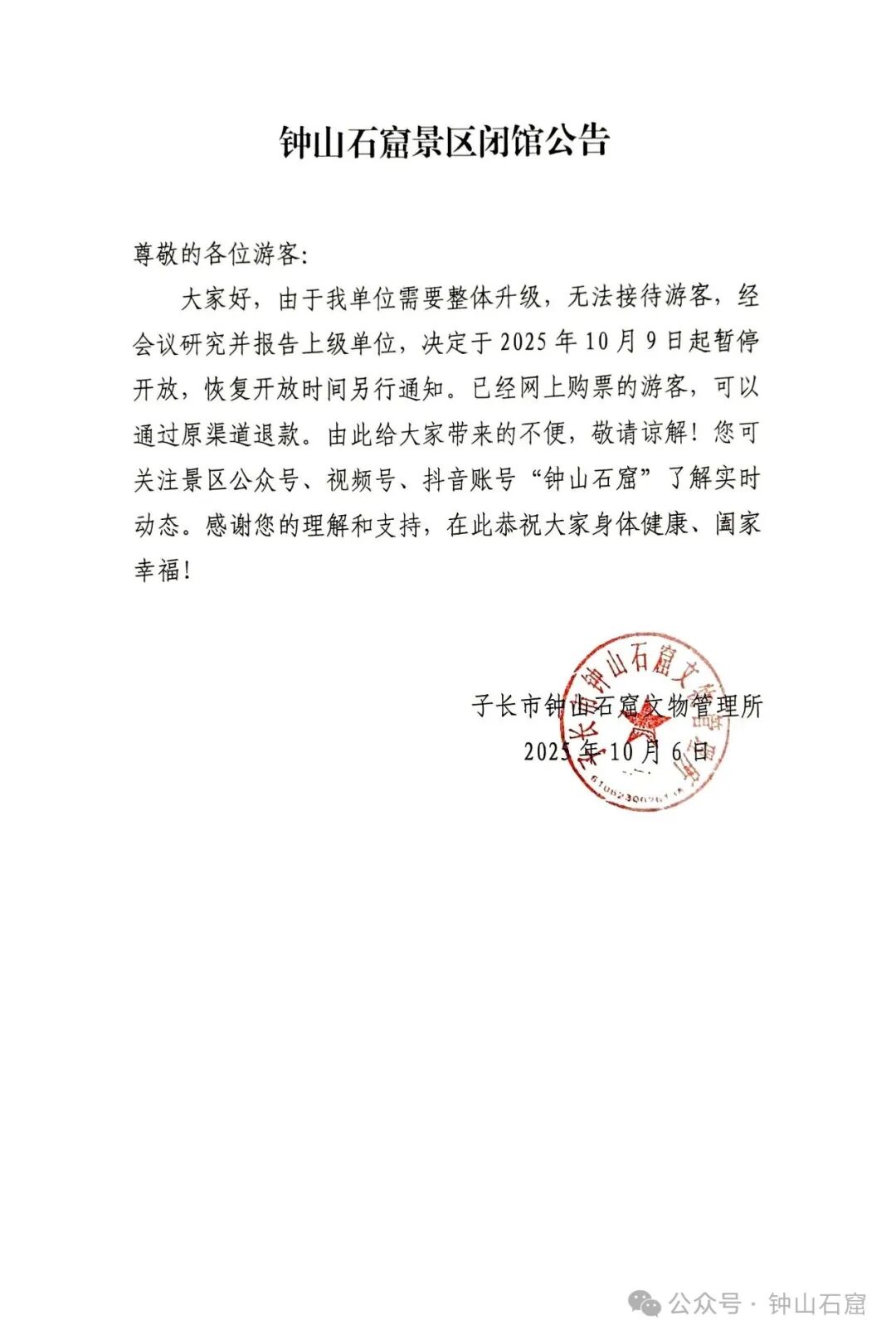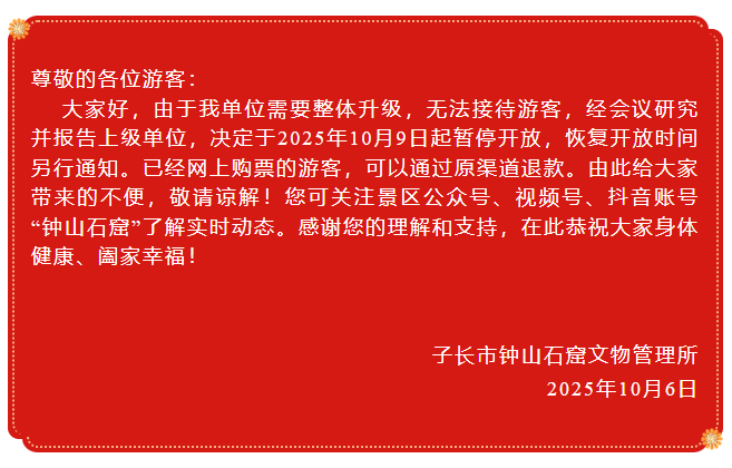 钟山石窟景区闭馆公告
